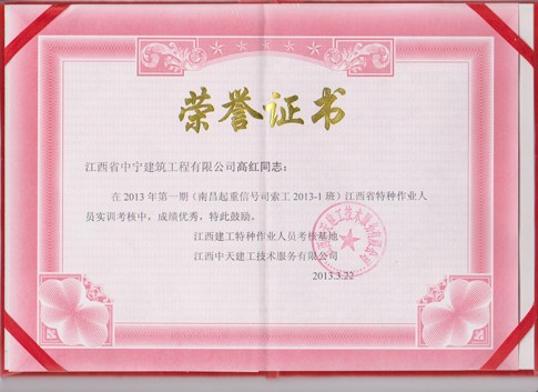 熱烈祝賀我司員工高紅在特殊工種實訓中獲得優秀學員稱號